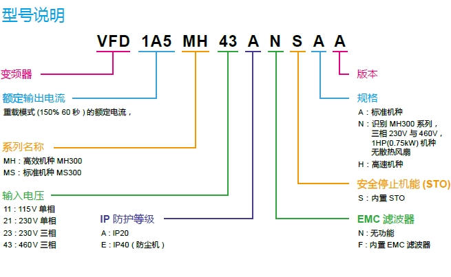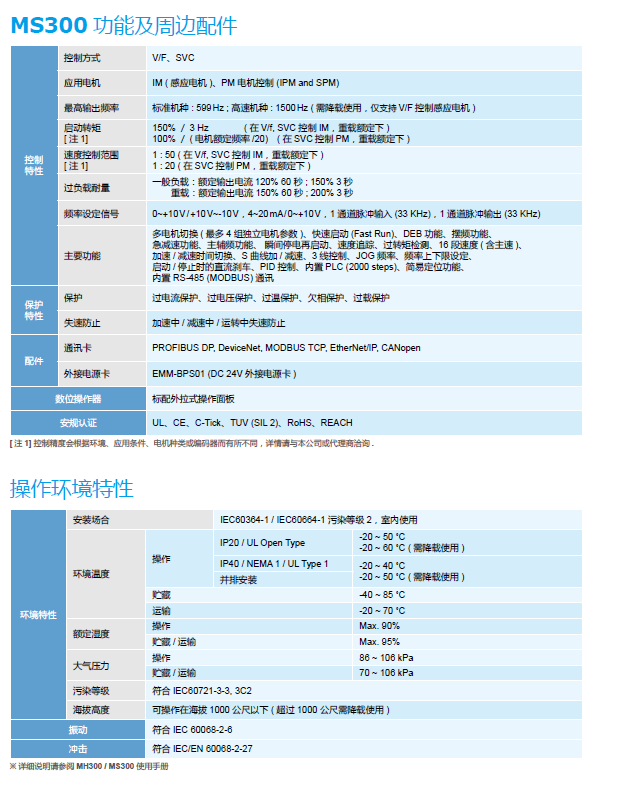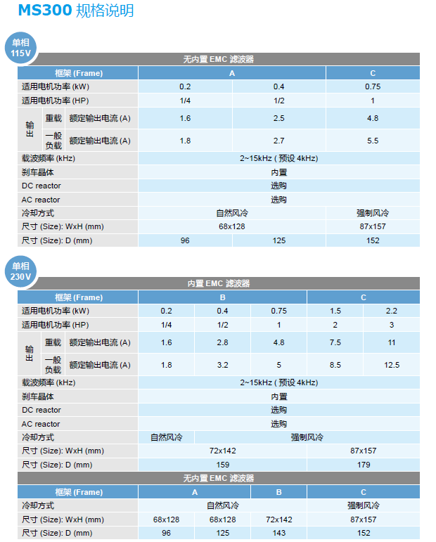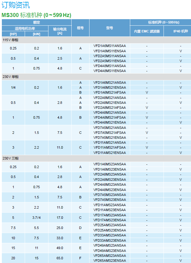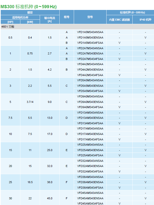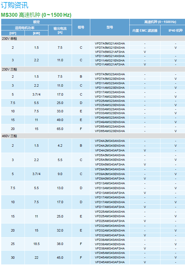 MS300 VFD5A5MS43AFSHA 3P460V,2.2kW,內(nèi)置剎車單元,高頻機(jī)種(max.1500hz),內(nèi)置濾波器(C2 Class),內(nèi)置PLC