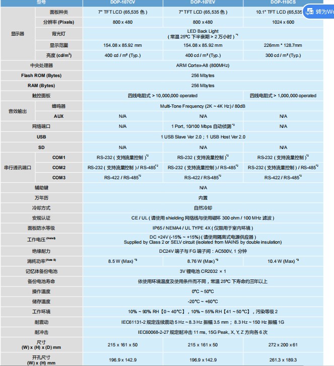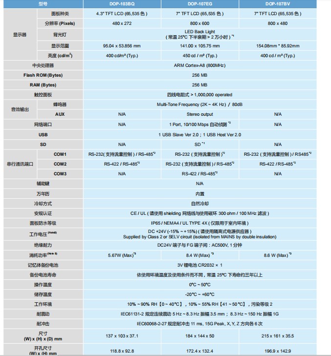 HMI DOP-107EV 7"/分辨率800×480/U盤/打印機(jī)/鼠標(biāo)/集成以太網(wǎng),高亮度400cd/㎡,COM1:RS-232, COM2:RS-232/485,COM3: RS-422/485