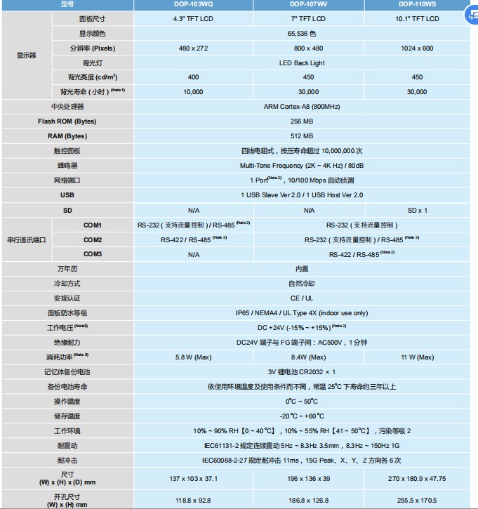 HMI DOP-110WS 10.1"/分辨率1024x600/U盤/打印機(jī)/鼠標(biāo)/集成以太網(wǎng)/窄邊框, 高亮度大于400流明,COM1:RS232, COM2:RS-232/485, COM3:RS-422/485,