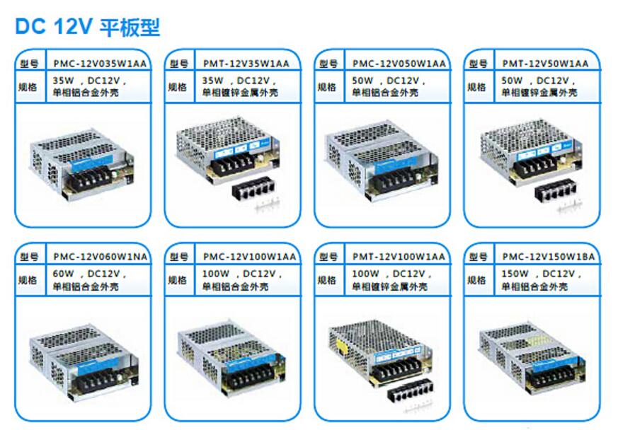 | 平板版型電源 | PMC | PMC-12V100W1AA | 85Vac~264Vac or 125Vdc~375Vdc 單相 |
