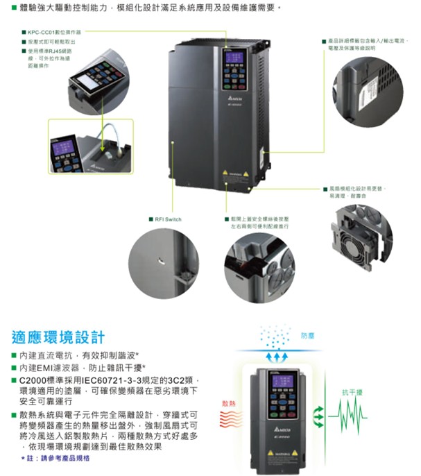 VFD-C2000 VFD220C43E 380V/3P,22kW,內(nèi)置10k PLC,內(nèi)建剎車,DC電抗選購,EMI內(nèi)建,UL,CE