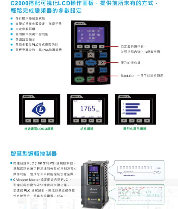 VFD-C2000 VFD015C23A 220V/3P,1.5kW,內(nèi)置10k PLC,內(nèi)建剎車,DC電抗選購, UL,CE